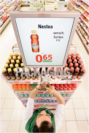 諸如商品名稱一類的固定信息打印在紙制標簽上并貼在液晶顯示器的下面。價格可以由商店來修改—或者在總部修改—而且在幾秒鐘內就能完成。事實上,未來商店的全部40,000件商品可以用不到一個小時的時間修改完畢。因為結帳系統與同一個無線數據系統相連,避免了出現價格錯誤的情況。