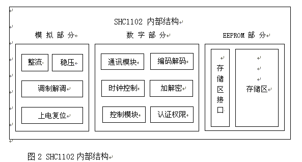 無線電子標簽(SHC1102)由射頻電路、控制邏輯、EEPROM接口和小容量EEPROM組成。對 SHC1102 的操作可通過讀寫機具中承擔著數據編解碼、相互認證、加解密等功能的專用集成電路 SHC1501 進行。華虹SHC1101和SHC1102產品可以使用同一臺讀寫器進行操作。